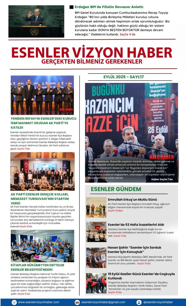 Dijital ortamda yayınlanan gazete, Esenler’in hem bugünü hem de geleceği için yol haritası niteliği taşıyor. Her sayıda ilçenin nabzını tutan Esenler Vizyon Haber, 17. sayısıyla da hem bilgilendirici hem de toplumsal dayanışmayı öne çıkaran içerikleriyle okurlarının karşısına çıktı.