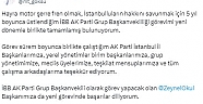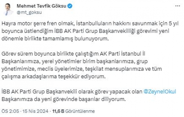 İBB Grup Başkanvekilliği sona eren Tevfik Göksu da gelişmeyle ilgili açıklamada bulundu. Göksu, sosyal medya paylaşımında şu ifadelere yer verdi: