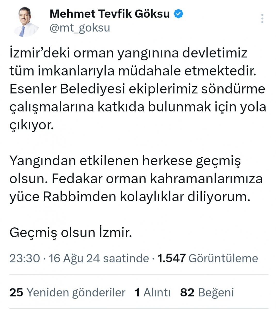 İzmir de devam eden yangına müdahale devam ederken Esenler Belediye Başkanı Mehmet Tevfik Göksu'dan bir açıklama geldi.